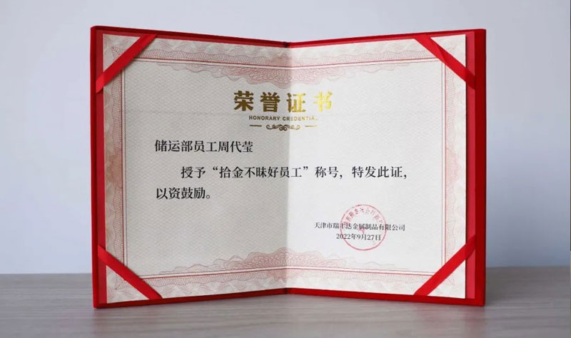 弘揚傳統(tǒng)美德,樹立時代新風,拾金不昧的行為雖然普通,但卻充滿了正能量。讓人們感受到美德的可貴。天津市瑞豐達金屬制品有限公司注重員工精神文明建設(shè),大力弘揚中華傳統(tǒng)文化及美德,學習先進典型,用榜樣的力量深入引導員工將文明道德與職業(yè)操守緊密結(jié)合,切實的做到內(nèi)化于心、外表于行。
