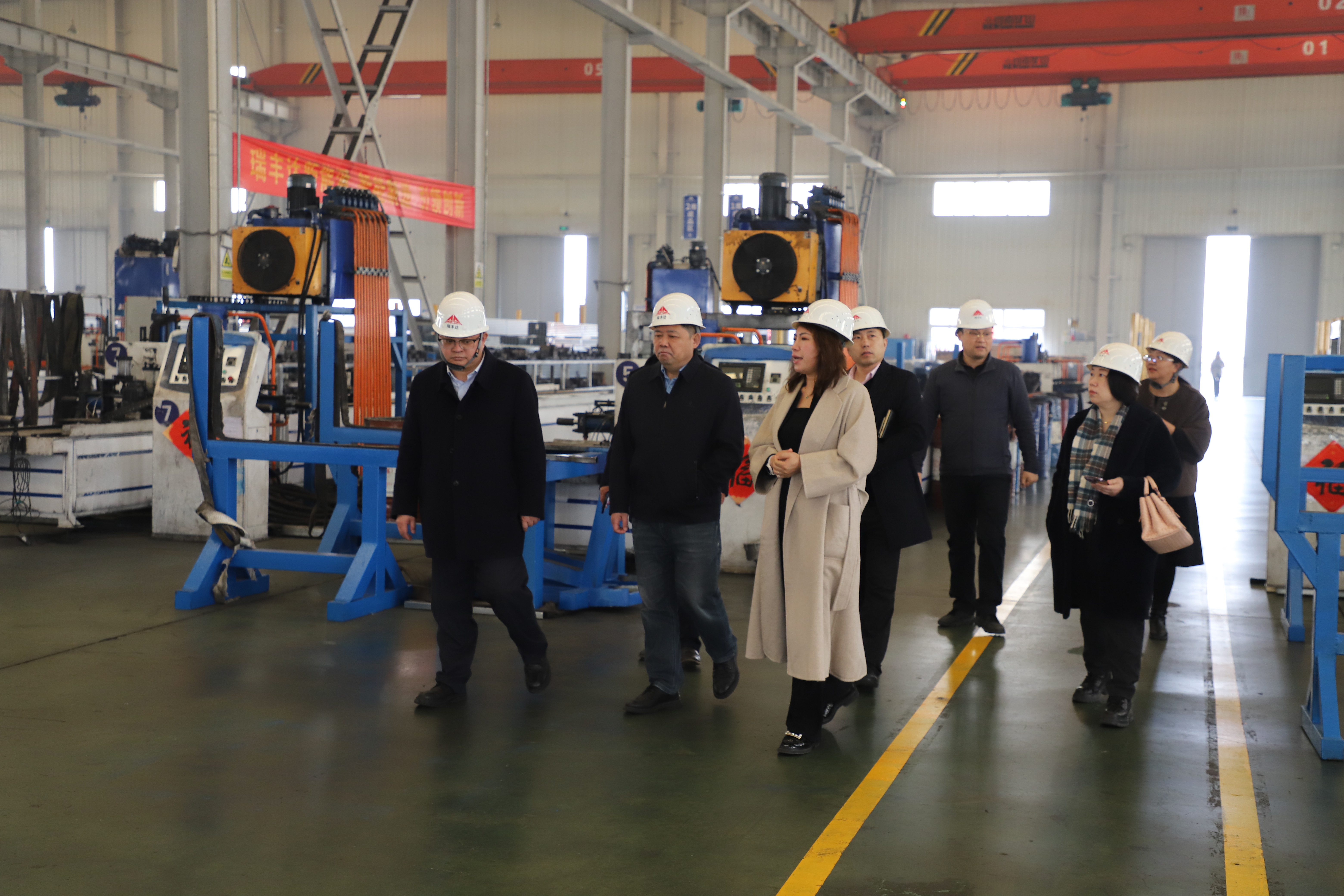與會人員親臨瑞豐達生產車間一線,深入了解瑞豐達光伏支架產品優(yōu)勢、產品研發(fā)、經營銷售等情況。領導一行邊走邊看,不時駐足詢問,了解了光伏支架的生產工藝、材料選擇及質量控制等關鍵環(huán)節(jié),對車間高效、智能的生產模式給予了高度評價。