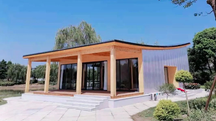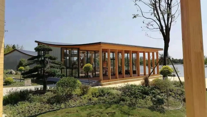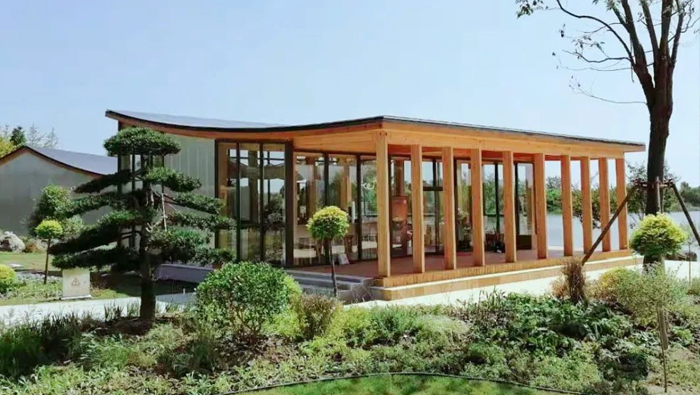 ? ? ? 采用了幕墻表皮的木構(gòu)建筑,示范了未來零能耗商業(yè)建筑,采用了定制化的咖啡廳場景。臨湖的護欄玻璃,是一幅透明的天鵝光伏畫,是全球第一例藝術(shù)光伏欄板。將技術(shù)與藝術(shù)完美結(jié)合。?