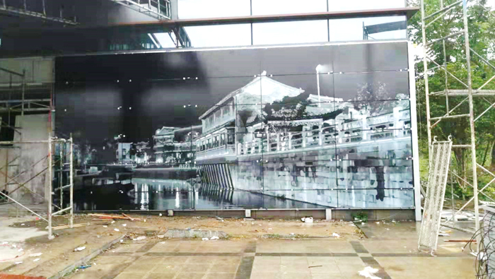 ? ? ? 全球第一幅光伏壁畫,通過特殊的加工,將稻河美景用木刻版畫的風格展現(xiàn)出來。 ?