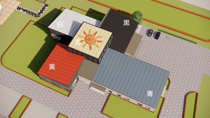 ? ? ? 展覽館的展廳屋頂由彩色太陽能組件構(gòu)成,根據(jù)社稷的造型分為東? ?西南北中,用五種顏色,青白紅黑黃,寓意五谷豐登、國泰民安。?