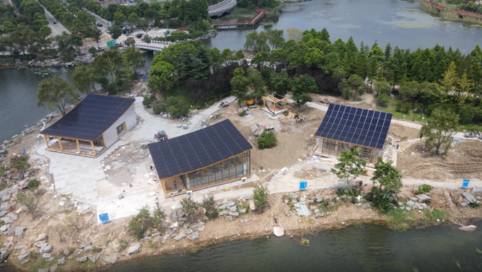? ? ? ????分別為“齋”“堂”“閣”“亭”,代表住宅、會議、咖啡廳等,實現(xiàn)家居、辦公、休閑等場景示范。三座建筑總面積為480㎡、裝機容量130KW、年發(fā)電15萬度,預計能實現(xiàn)年減排二氧化碳120噸。?