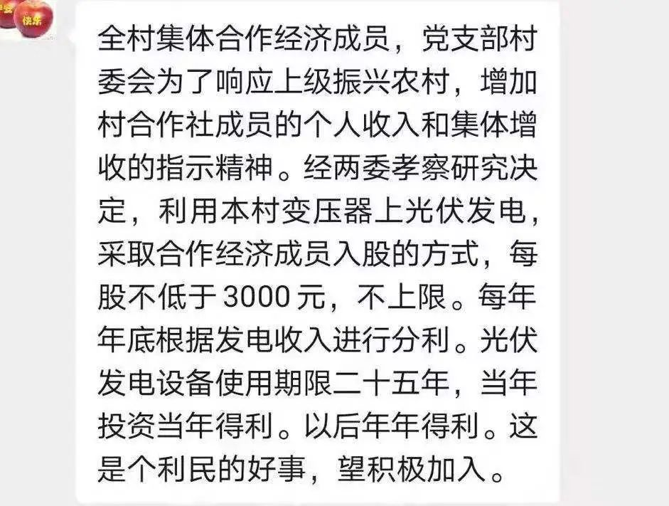 最近,有朋友發(fā)了一張圖,說(shuō)他們村開始通知村民集資建光伏電站了,然后年底進(jìn)行分紅。一時(shí)間來(lái),老百姓的投資意識(shí)又提高了,開始集資建光伏電站了。