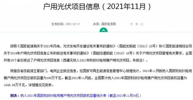 根據(jù)國家能源局統(tǒng)計數(shù)據(jù),截止到2021年11月30日,全國僅2021年納入國家財政補貼的戶用光伏就已經(jīng)達到了1648萬千瓦,遠遠超出今年的戶用光伏補貼指標。如果算上最后一個月份的話,最少也在1800萬千瓦以上。今年一年的全國的安裝戶數(shù),預(yù)計在100萬戶以上。